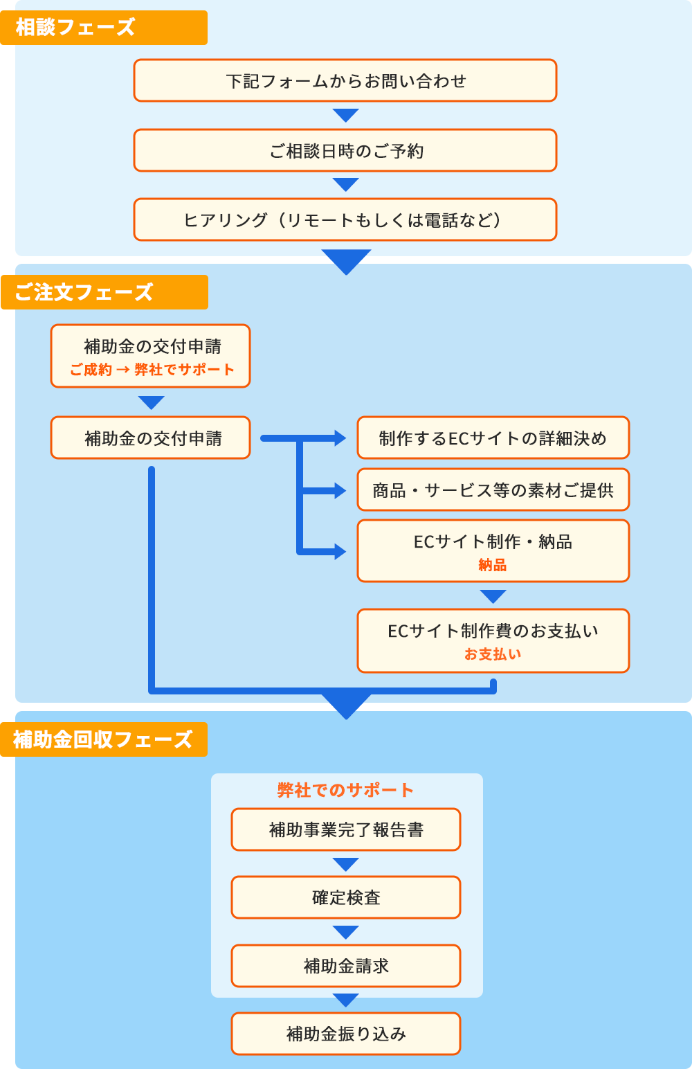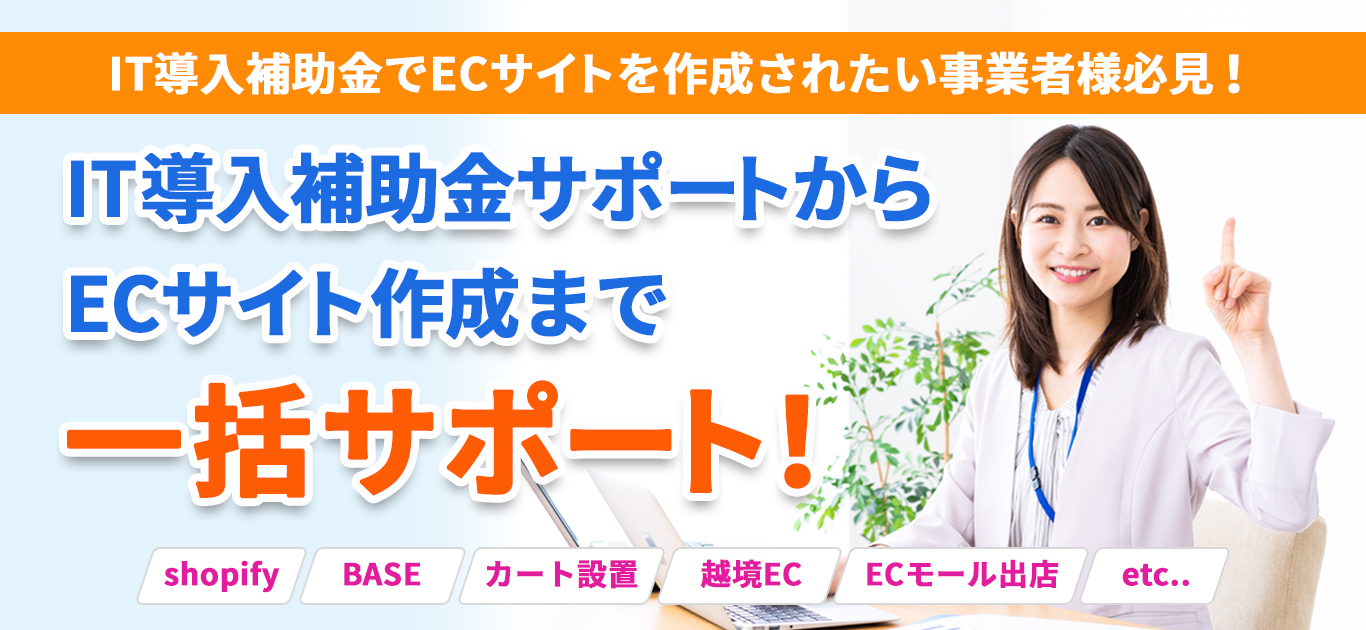 これからECサイトを立ち上げたい、または商品紹介ページにカートを設置したい、越境ECをお考えの事業様、ぜひ私たちIT導入補助金サポートのプロに一度ご相談ください。 申請から作成までの流れは勿論、どの様なものが対象になるか、逆にどの様なものが対象にならないのかも含めて詳しくご説明させて頂きます。