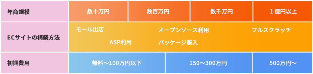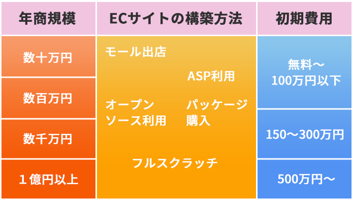 ECサイト立ち上げにかかる初期費用の相場は、構築方法によって次の通りです。